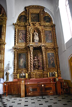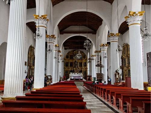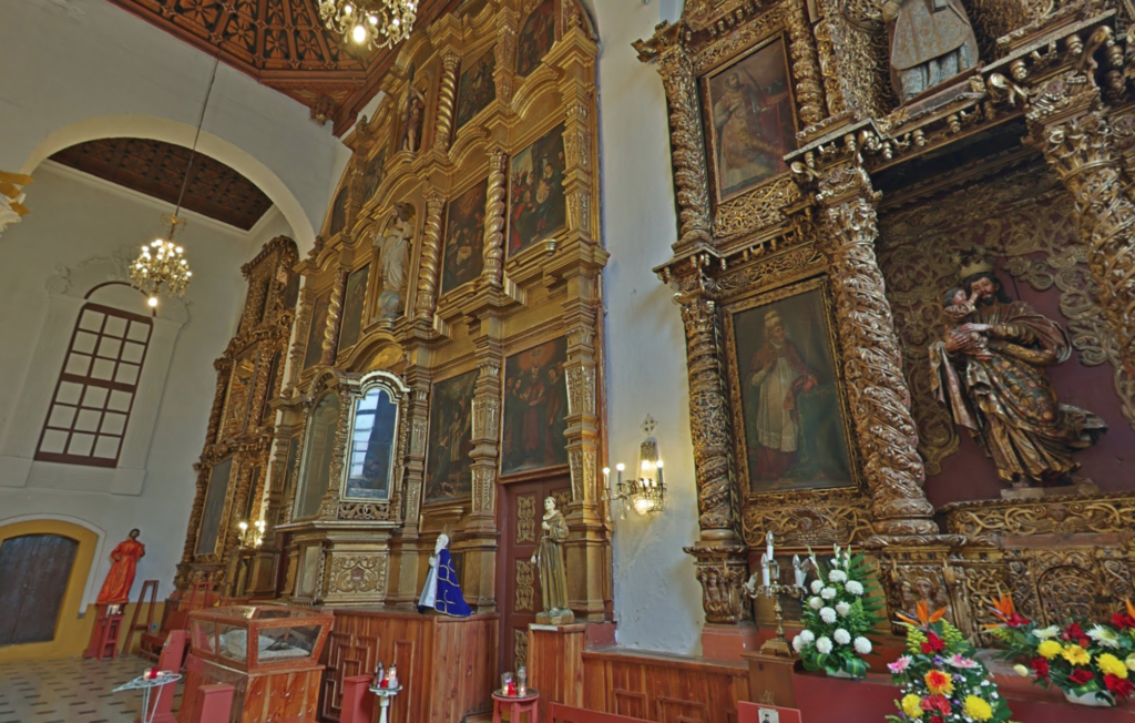aire libre, decorado con una intrincada labor de argamasa que presenta motivos vegetales, figuras de santos y nichos que parecen bordados sobre la piedra. Al entrar, la atmósfera cambia hacia una sobriedad majestuosa; el interior resguarda valiosas piezas de arte sacro, incluyendo retablos bañados en pan de oro y pinturas coloniales de gran valor histórico. Destaca el púlpito tallado y la presencia de imágenes que son objeto de una devoción profunda por parte de las comunidades indígenas y mestizas que convergen diariamente en su nave central.