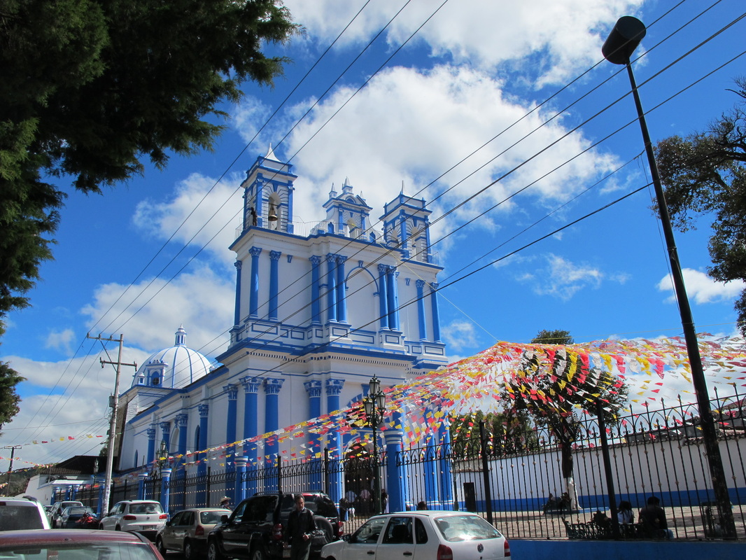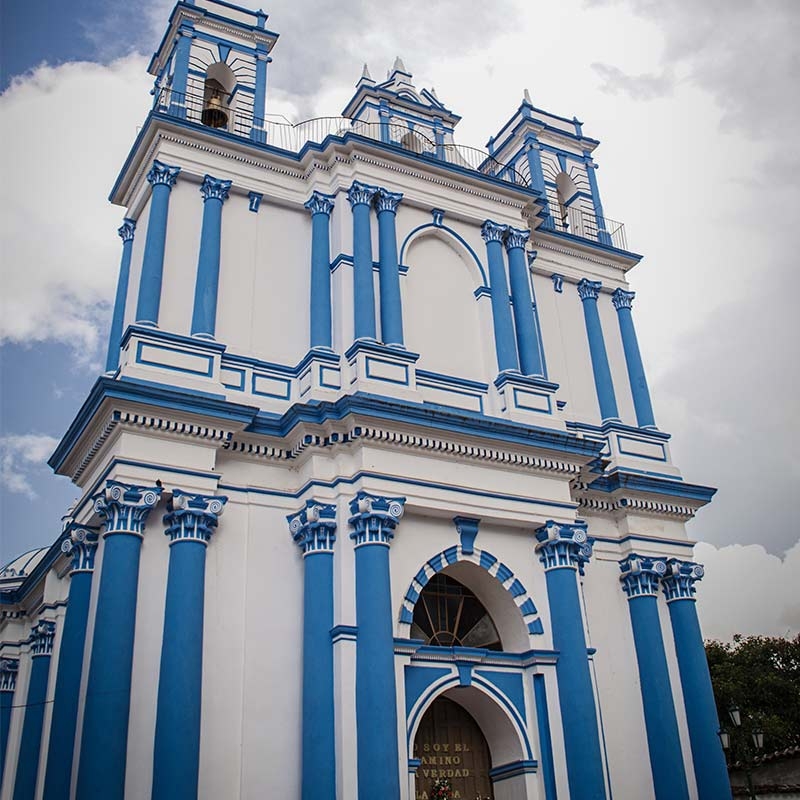 Ubicada hacia el sur del centro histórico, esta joya arquitectónica destaca por su fachada ecléctica donde predomina un color azul celeste intenso, combinado con detalles en blanco y amarillo, lo que la hace resaltar de forma única frente al cielo de los Altos.