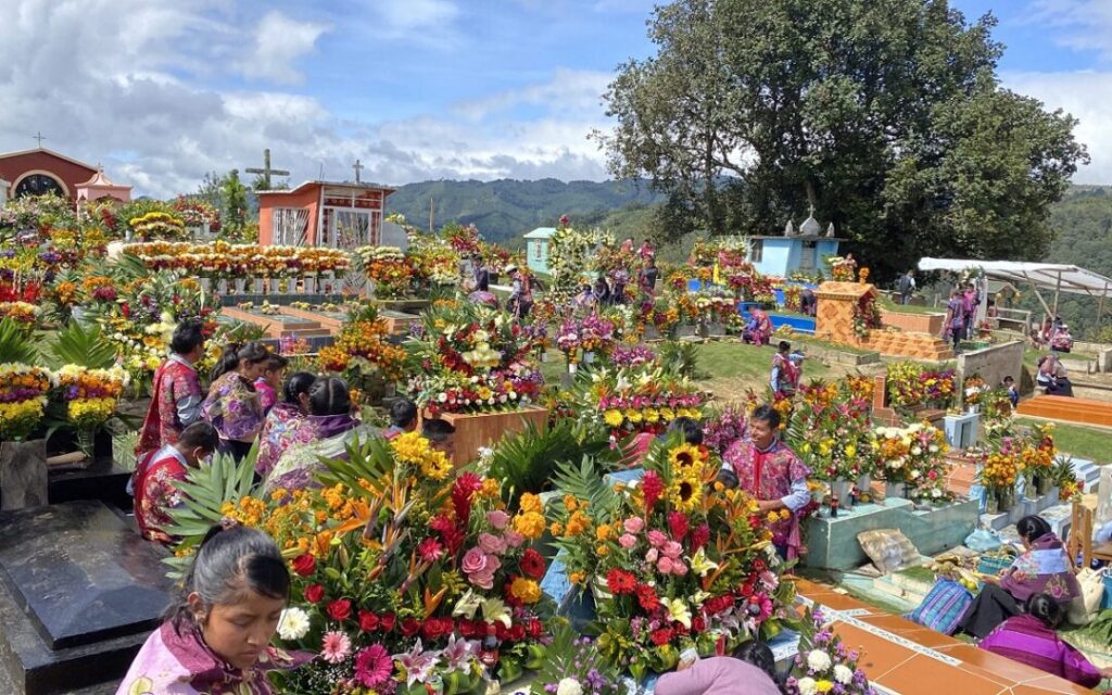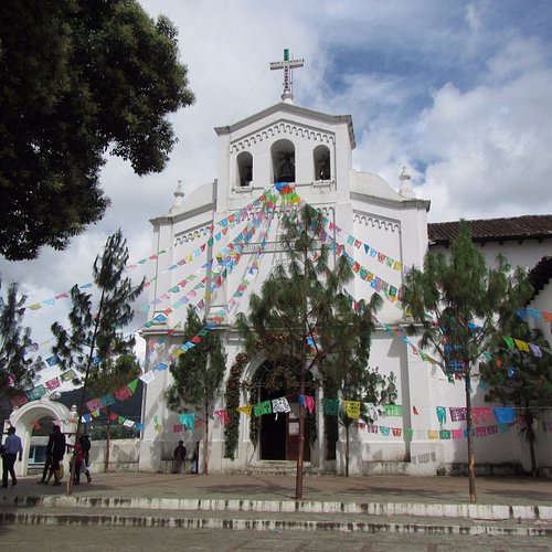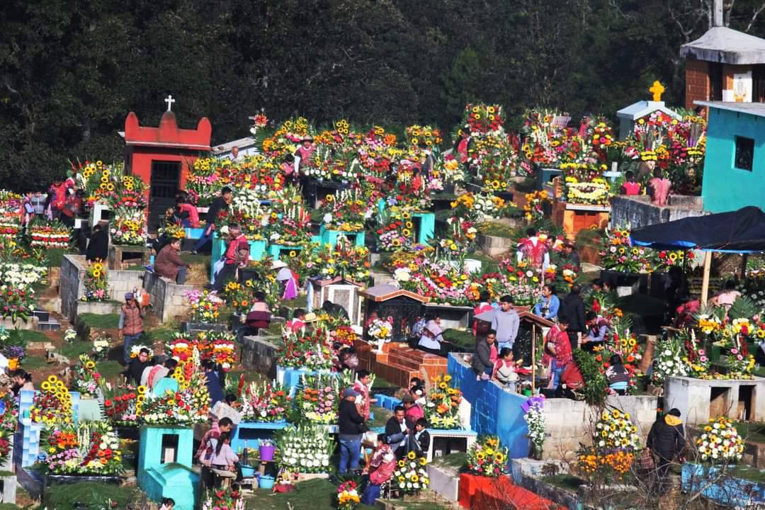 en su vestimenta tradicional. Tanto hombres como mujeres lucen hermosas prendas bordadas con motivos florales, cuyos colores evolucionan según la moda de la temporada; de los azules y morados intensos de hace unos años, han pasado a tonos rosados, verdes y multicolores. El corazón del pueblo es la Iglesia de San Lorenzo, un espacio sagrado decorado con arreglos florales monumentales que cambian constantemente, llenando el aire con un aroma dulce y fresco. Aunque aquí también se practica el sincretismo religioso, la atmósfera es más luminosa y abierta que en los pueblos vecinos, reflejando la alegría de su gente.